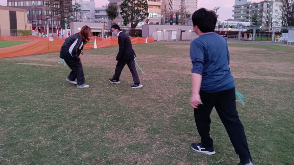 目の前のシバヒロを使って屋外でモルックやタグラグビーも行います。室内では卓球やボクササイズを。遊びを通して体を動かし、ルールやマナーも学んでいます。