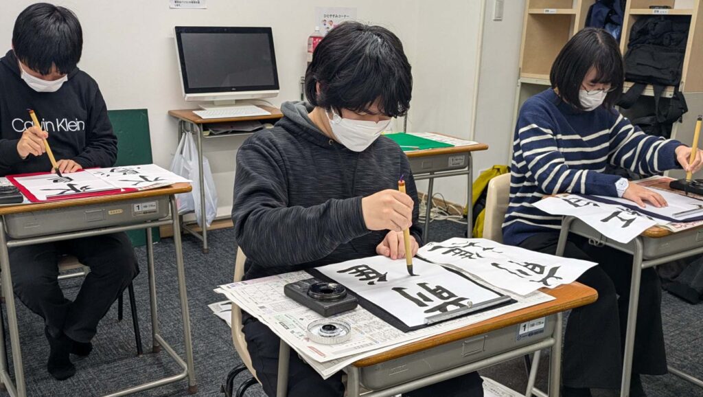 毛筆、硬筆をの両方を行っています。暑中見舞いや年賀状を書いたり、書初めをしたり季節感を取り入れています。文字を書くこと、止めやはね、はらいなど指先の練習にもなっています。
